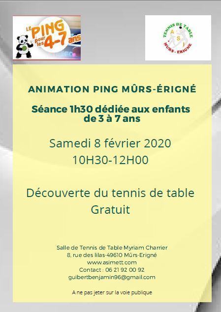 Initiez vos Bambins au Tennis de table. Animation ludique. Séance découverte dédiée aux enfants de 3 à 7 ans le 8 février 2020 de 10h30à 12h00 Salle Myriam Charrier. Inscription possible sur asittmurs@gmail.com